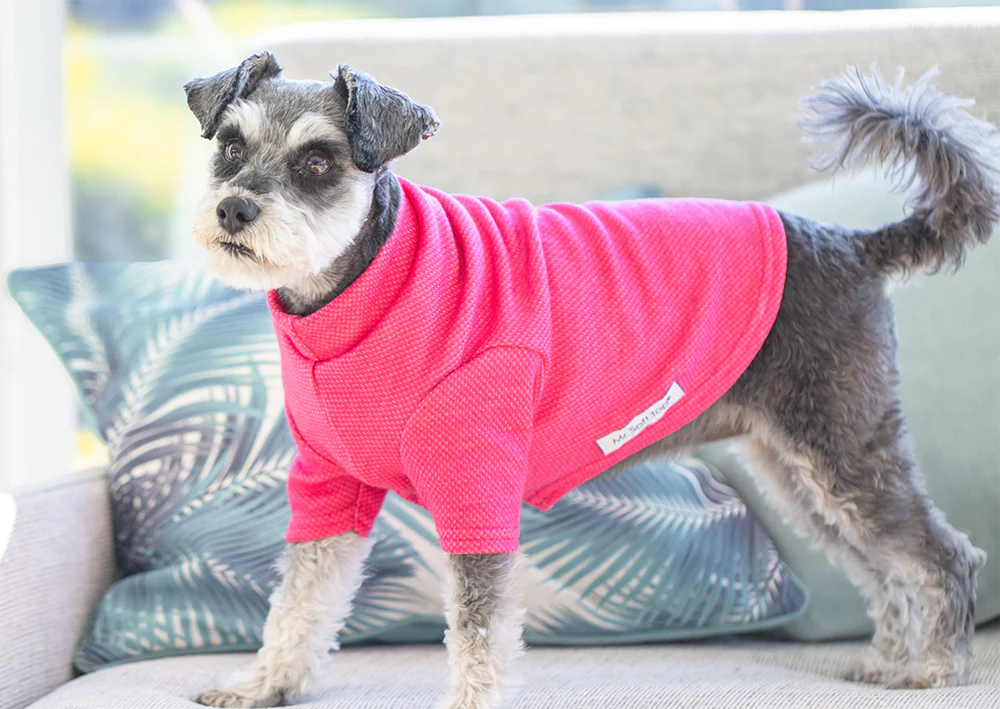 This pretty pink tee combines style and function, making it a must-have for active pups. The fabric features a dual-layer design, the outer layer features 100% merino wool for softness and comfort, while the polypropylene lining efficiently wicks away moisture to keep your dog dry and fresh.