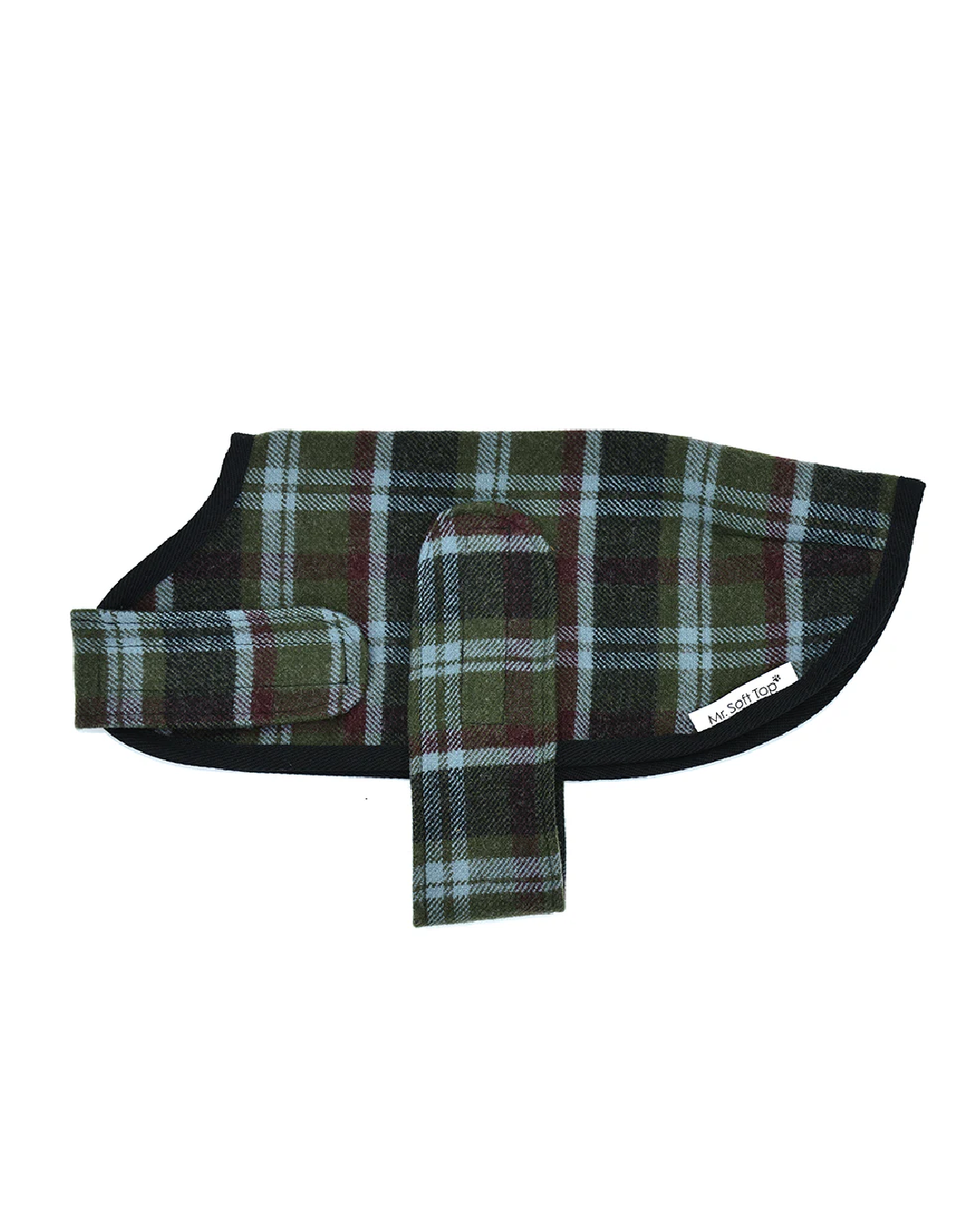Olive green is the perfect winter shade this season. This Olive green and Light Blue tartan coat is great for all occasions. The fabric is self lined with a charcoal back to keep your pup warm over winter