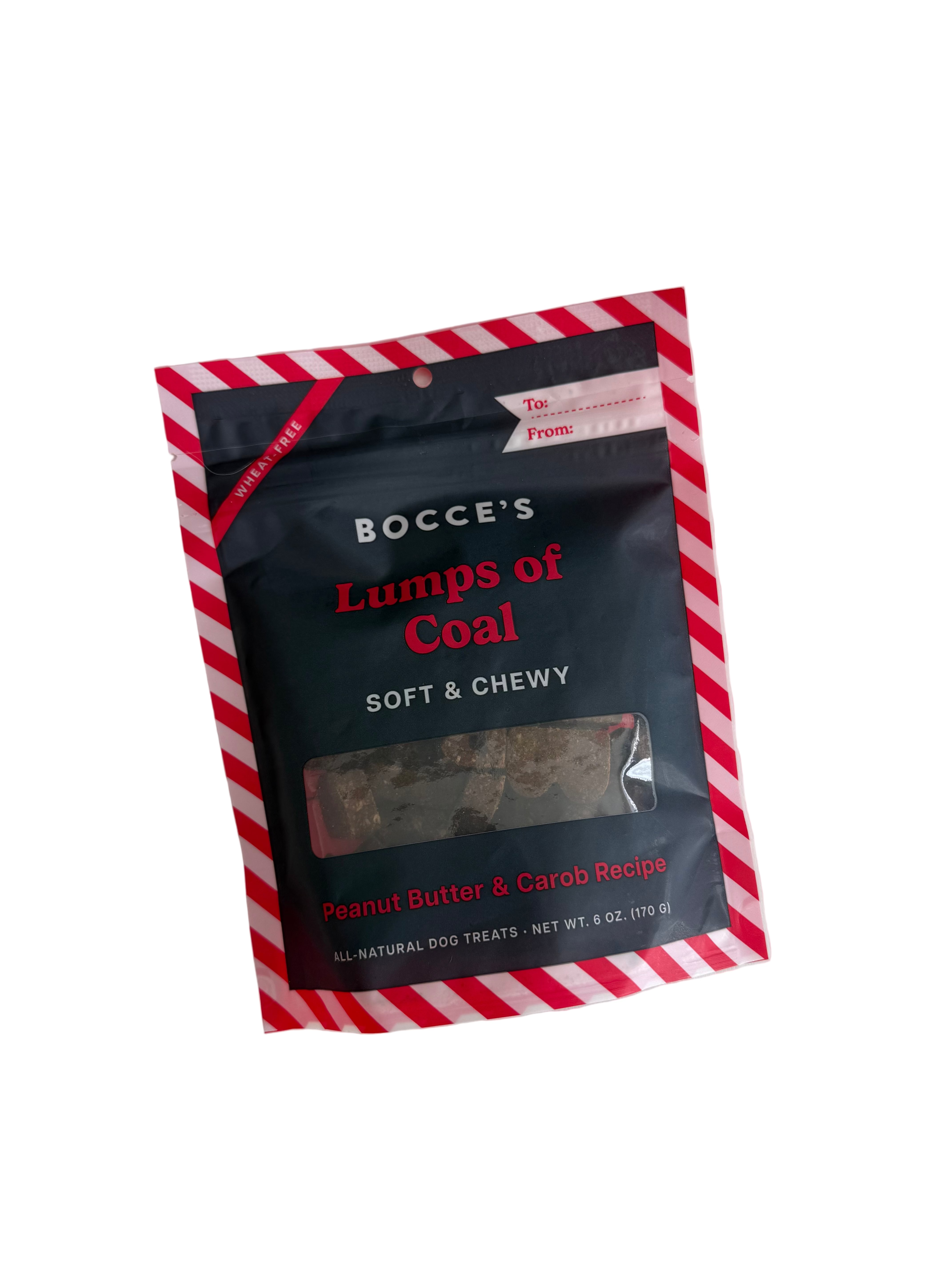 Lumps of coal for the not so good but good doggies. Soft and chewy treats, peanut butter and carob flavoured. Wheat free. 170g packet.