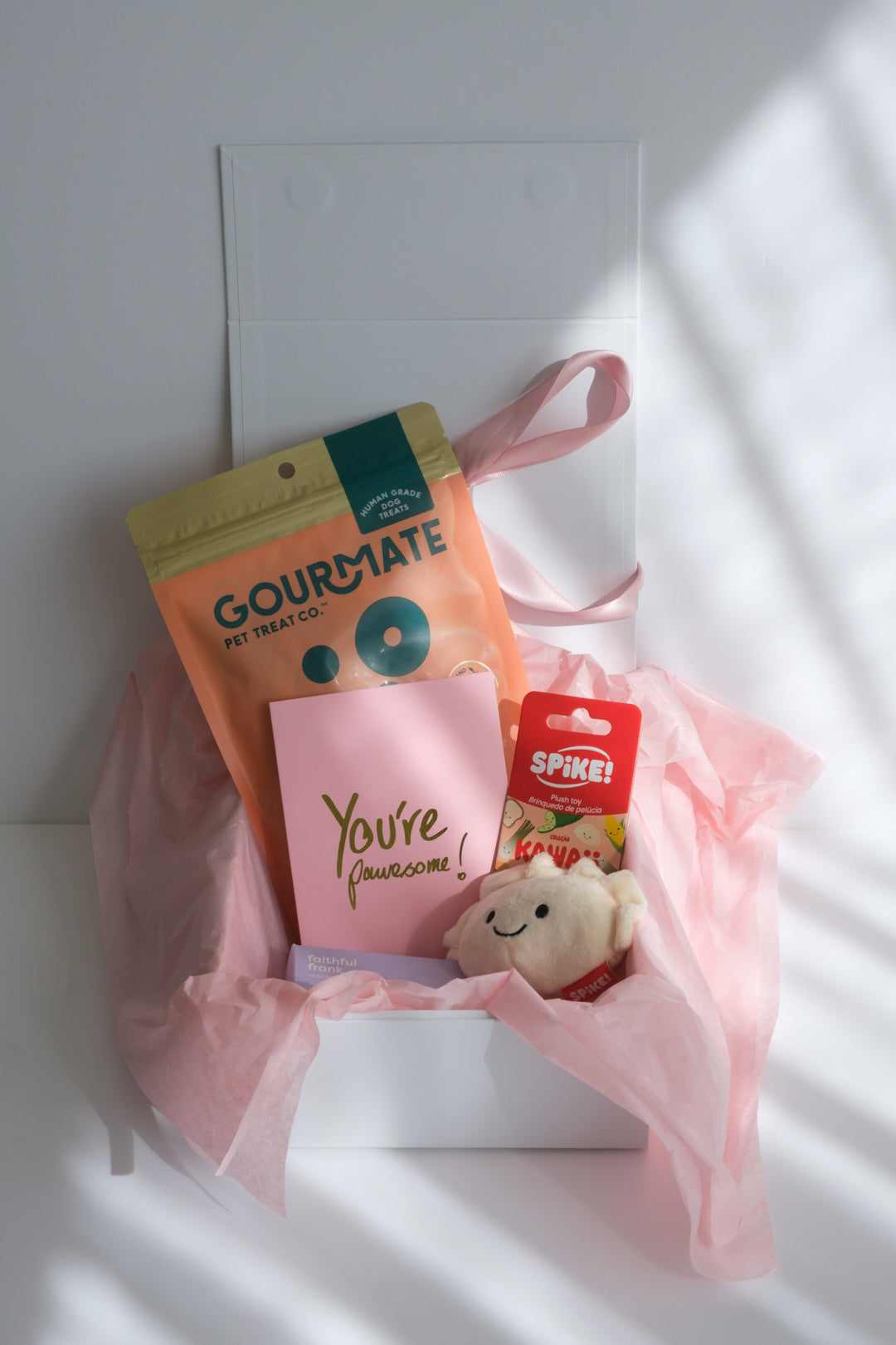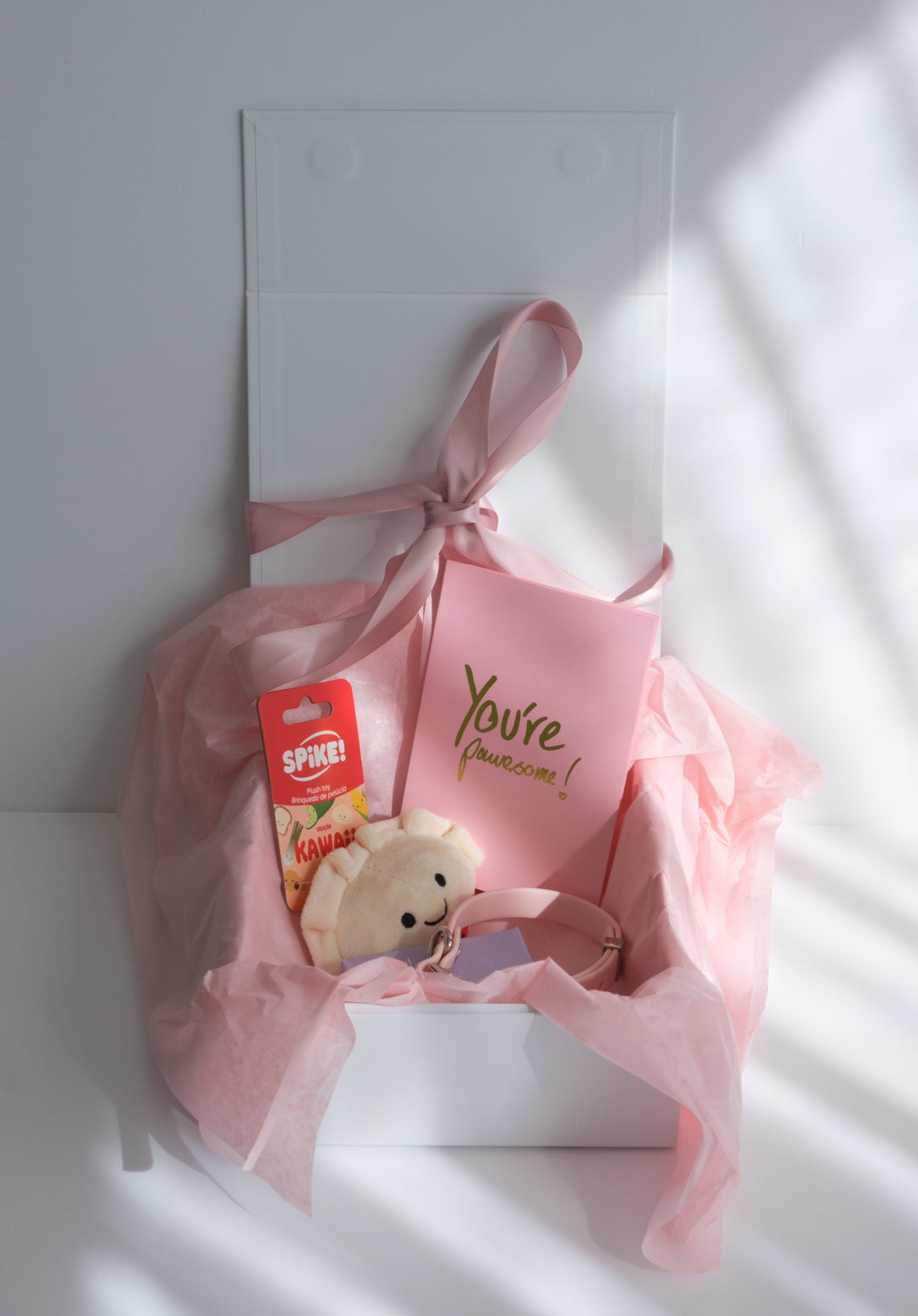 Our Smack Bang collection gotcha gift boxes are carefully designed to suit any dog. Delivered in a white magnetic hinged box, this box features a card, tissue and satin ribbon. The box will be shipped in a normal cardboard shipper.