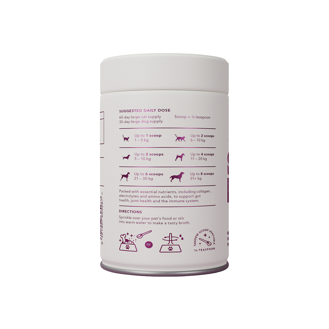 Directions: Sprinkle: Add a flavourful boost by sprinkling the powder directly onto your pet's meal. Mix: Blend it into their food for a seamless and nutritious treat. Rehydrate: Stir into warm water to create a nourishing and hydrating broth. Shake It Up: Stir it into Shake Make for an extra level of excitement and enrichment!