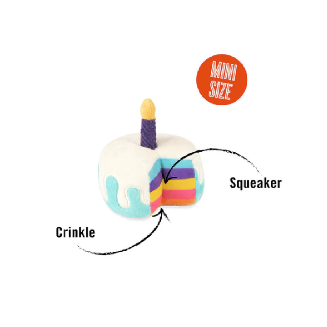 This perfectly sized birthday cake features a squeaker for playful excitement and crinkle fabric for added texture. Celebrate your furry friend's special day with a toy crafted for tiny paws and playful indulgence!