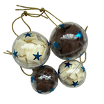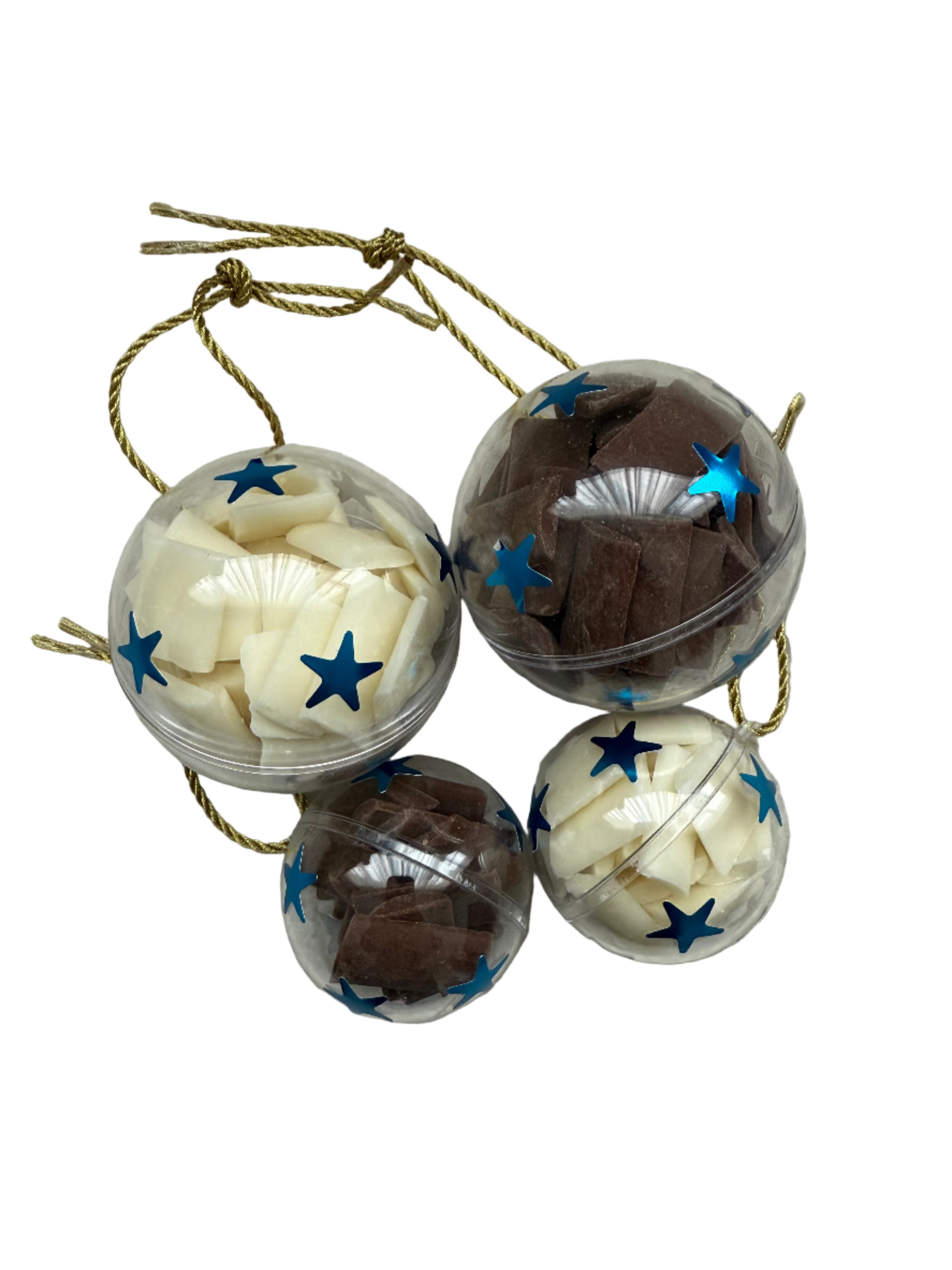 Shatterproof clear plastic, re-usable baubles filled with Scoop Dog Splats. Baubles are either 5cm or 7cm in diameter and hang off a 1.5mm gold cord.