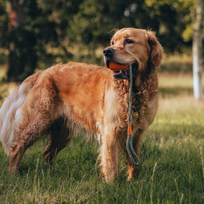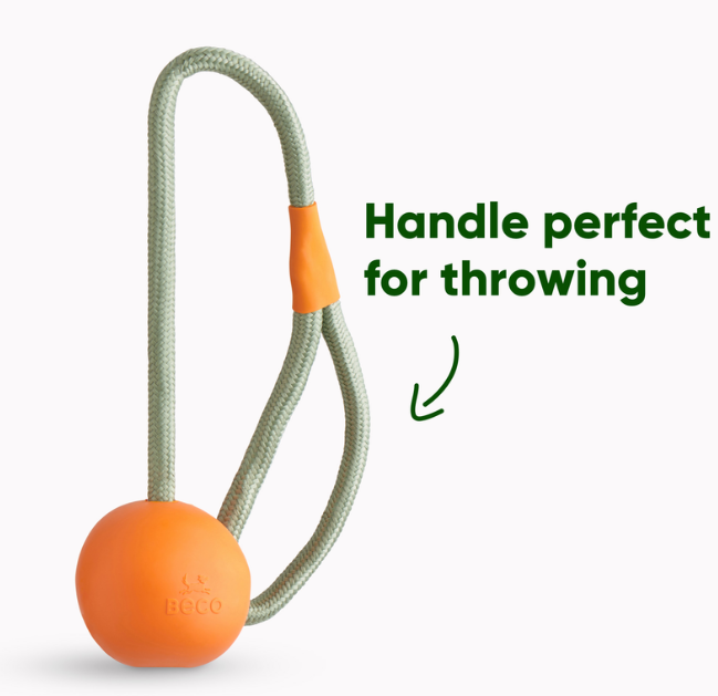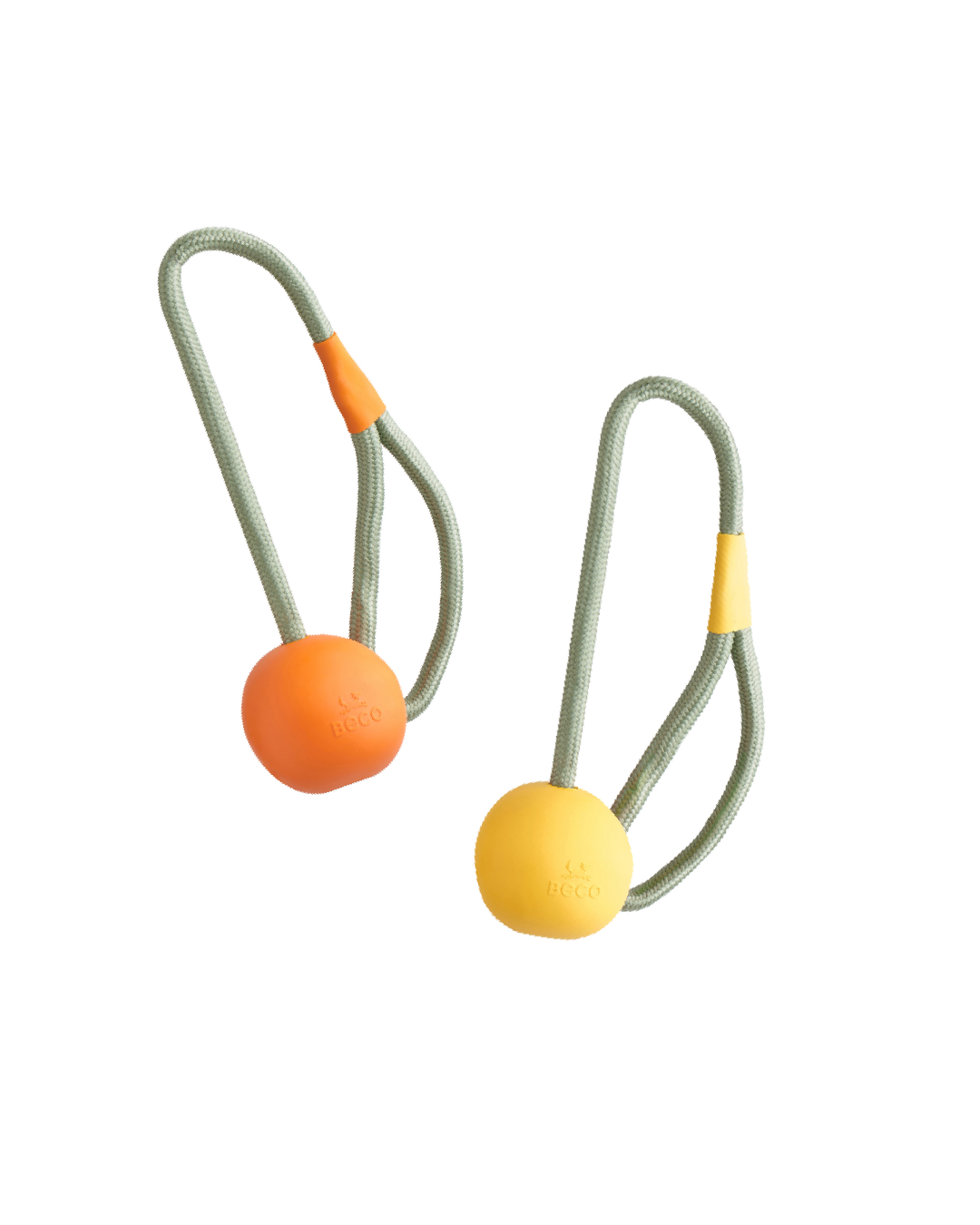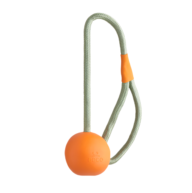 A natural rubber ball on a strong recycled rope. The springy natural rubber ball is easy for your dog to grip, and the rope gives you extra throwing distance. Ideal for a game of fetch. The rubber has a gentle vanilla scent.