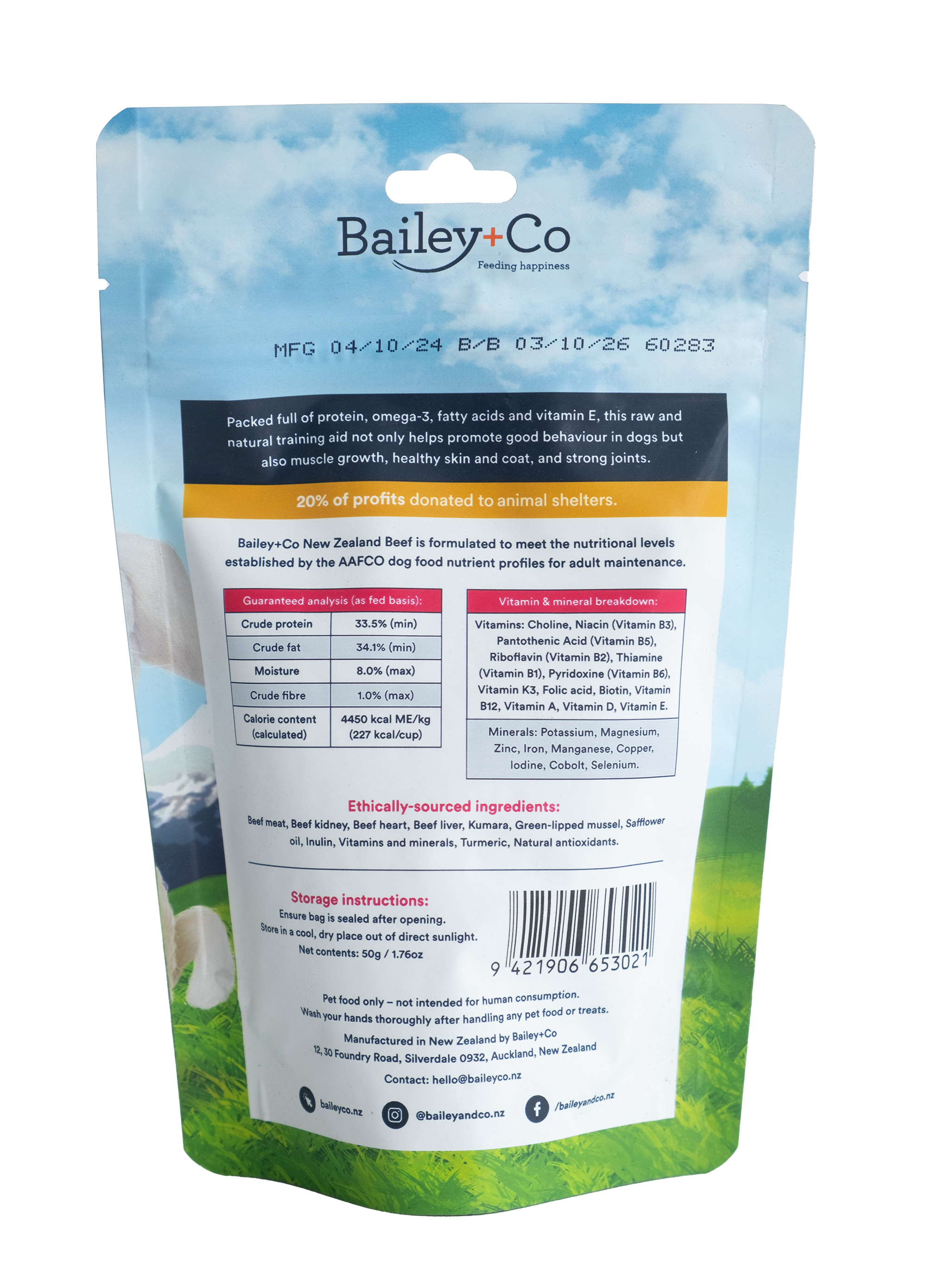 Promoting optimum development, our raw and healthy New Zealand Grass-Fed Beef bites makes a completely nutritious behavioural training reward. Complete, wholesome and delicious.