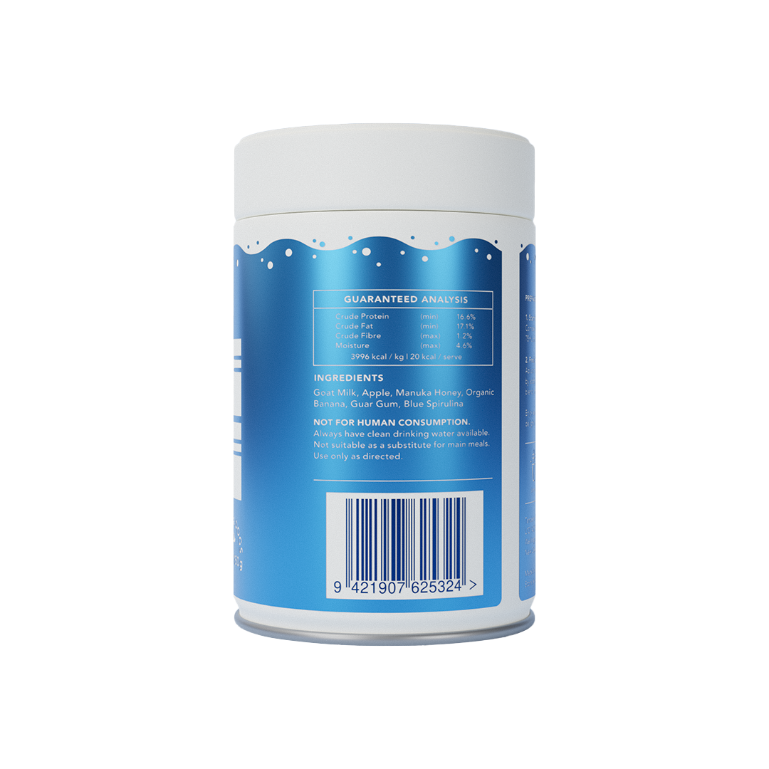 Ingredients: Goat Milk, Apple, Manuka Honey, Organic Banana, Guar Gum, Blue Spirulina
